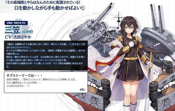 “重樱”舰队里的元老级人物,大家都称她为“大前辈”“三笠大人”。在往昔局势还未稳定的岁月里,她为“重樱”的发展壮大而拼搏,立下了卓越的功勋。如今虽已退居二线,可她的气势丝毫没有减弱,依旧是指引后辈成长的优秀长官。