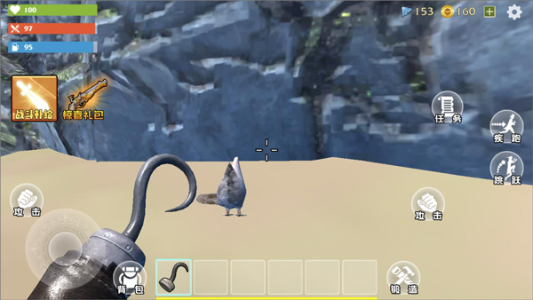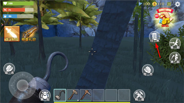 玩家完成新手引导进入游戏后,游戏操作界面会显示任务、疾跑、跳跃、攻击、锻造、背包等功能栏,此时点击任务栏即可。