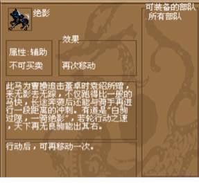 写到这里,忽然记起杨家将传奇里七郎登场时那首“万水千山纵横,岂惧风急雨翻”的配乐——豪曹的绝影所具备的二次移动能力,确实能让人感受到“万水千山纵横”的畅快。绝影的二次移动常常能实现“杀人于无形”的效果:完成行动后迅速撤离现场,最具代表性的莫过于神鸟徐州投毒案,当时蜀国四位将领便接连遭郭嘉下毒暗算。绝影是一件集多种作战功能于一体的宝物,我们既可以用它快速奔赴目标地点,也能借助它在发起攻击后重新调整站位。相对而言,它是比较适合文官使用的装备,尤其是郭嘉和贾诩这类角色;像麦城、赤壁1、赤壁2这类大地图关卡中,绝影的二次移动能力往往能发挥至关重要的作用。