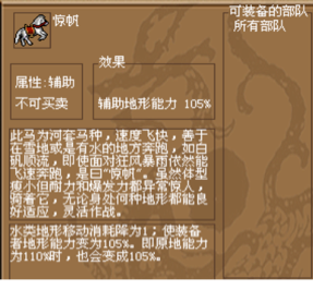 地形固定为105,而且不会受到雨天的影响。这是水战中必不可少的道具,在前期能够为缺乏地形优势的武将提升地形效果,不过全地形105的强化作用相对有限。