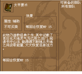 豪曹里带蓝量回复效果的宝物挺多的,太平要术这东西估计是专门给那些特别费蓝的角色设计的。前期每回合回15点MP基本跟无限蓝没差,到了中后期关卡回合数比较多,或者我军经常用回归的时候,这每回合15点的回蓝对耗蓝高的法师来说作用还是挺突出的。要是我军等级在20到30级之间,文官那边又不太用得上,把它给李典用来打连击也可以。
