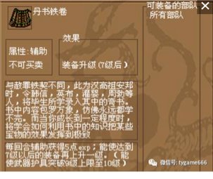 这件宝物的评价很容易走向两个极端:热衷极限冲级的玩家会视若珍宝,而对升级兴趣不大的玩家则觉得它食之无味。我本身对冲级没什么执念,丹书铁卷在前期确实用处不大,每回合加5点经验基本是聊胜于无,通常都是谁没带辅助就给谁凑数。这类辅助型宝物得等升到9级后才能真正体现价值,10级时则能带来更丰富的搭配空间。20150707版本调整武器等级后,人物到40级宝物就能到9级,但对非冲级玩家而言,40级已经是游戏后期了,能让这件宝物发挥10级效果的关卡其实不多。我个人更推荐优先把鹰眼金槊和黄龙甲升到10级。