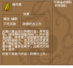 另外,煌光盾还有解除debuff的副效果,在部分我方武将易中debuff或被敌军攻击附加debuff的关卡(比如赤壁2、鱼腹浦等),能起到恢复状态的作用,这一点值得注意。评价:B 纯防御辅助,防御能力一般。