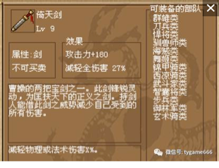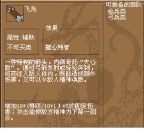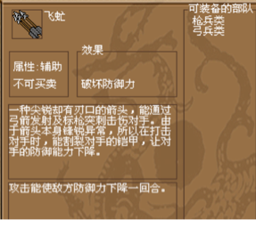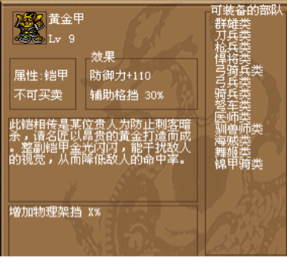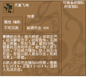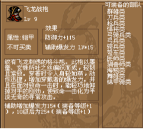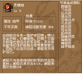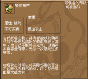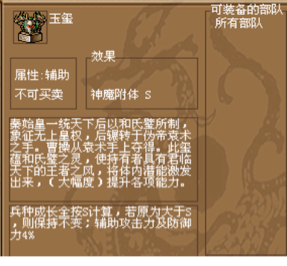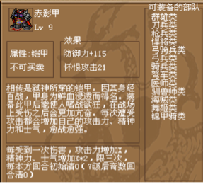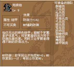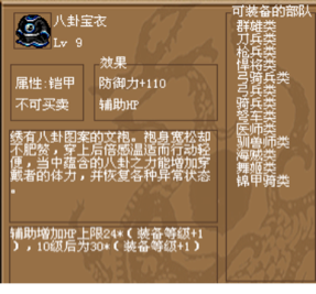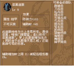 评价:B 在曹操传MOD里,这件装备算是比较常见的撑血类道具,对兵种的使用限制不算大。