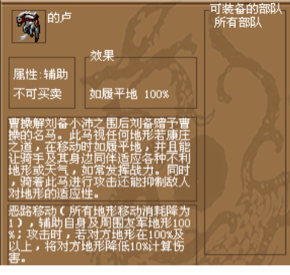 的卢的恶路移动特效与《三国演义》里刘备马跃檀溪的典故十分贴合,不过这仅仅是它所有特效能力的三分之一。实际上,的卢是集地形、光环和攻击强化三类能力于一体的宝物(严格来讲,全地形100%适应度与全地形移动力消耗为1应算作两种能力,所以的卢马其实具备四种特效能力)。这些能力都相当实用:单是全地形100%适应度与全地形移动消耗1这两点,我觉得就足以碾压惊帆;而它攻击时削弱敌军10%地形适应度的效果,也不比将军盔6%的加成逊色;地形光环应当是它最核心的能力——在雨天或恶劣地形中,的卢能为周围队友提供100%的地形支持,是维系我军队伍战力的关键依托。