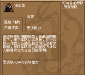 这件宝物能同时提升武将的攻击与防御能力。虽然从介绍来看,它的“无视能力”大概率只针对攻防属性,但在防御和仇恨转移方面仍有一定效果。不过它对进攻的加成相对有限,到了后期,像灰影、鬼谷子、燎原火、虎符这类功能相近的宝物比比皆是,将军盔在其中几乎没什么突出优势。特效方面,它和古锭刀比较相似,两者搭配使用能显著强化武将的攻防表现;要是再能占据优势地形,甚至能达到一夫当关的效果。