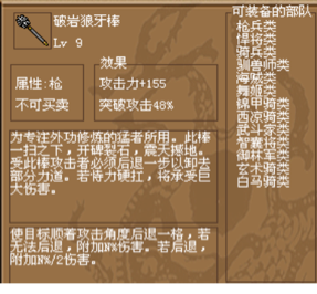刚降伏了几个妖,又拿下了几个魔,魑魅魍魉怎会这般多?嘿嘿,吃俺老孙一棒!打得你魂飞魄散,神鬼皆颤,狼虫虎豹无处遁形。拿这段歌词来描述狼牙棒的突破攻击效果,实在是精准至极——它能在敌方回合大幅提升反击次数。狼牙棒对无法推动的敌军,伤害加成比开山斧还要高;即便面对可推动的敌军时加成减半,却能额外获得一次反击机会来增加输出总量。因此,尽管狼牙棒在攻击性武器中,面板属性和基础增伤并非顶尖,但往往能打出相当可观的总伤害。 狼牙棒的突破攻击,与此前提到的增益攻击范围一致,都是我军在敌方回合提升反击伤害的有效方式。前期将其配给穿炎狐甲的大夏侯,中后期交给曹仁或虎贲徐晃,效果都颇为理想。利用狼牙棒推开敌军,有时能缓解我方被包围的局势,或是打破敌军的ZOC限制、从阵型中撕开缺口、打乱敌方部署,战术价值极大。不过,反击时推开敌军会让使用者承受更多攻击,因此狼牙棒对持有者的能力要求不低,防御属性必须足够过硬才行。