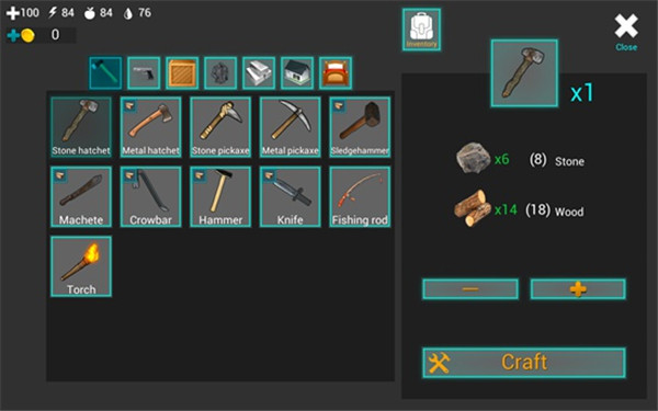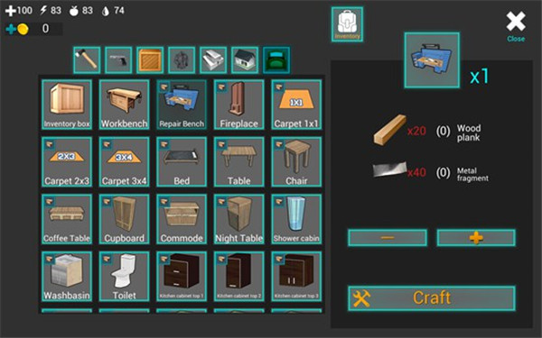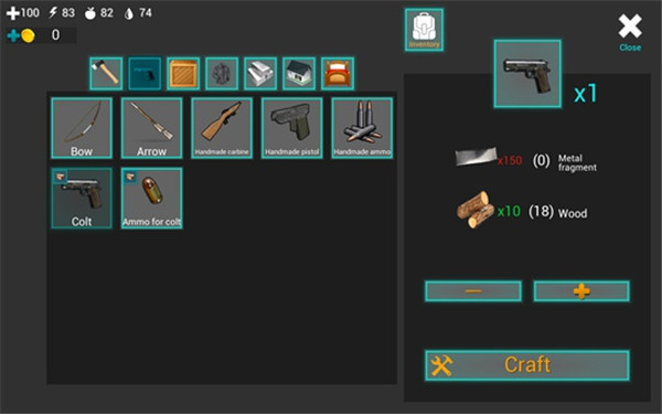 不过现在我们首先要做的还是生一堆火,生一堆火需要7根木头,点击火堆图标,再点击右下角的“Craft”按钮,就能把它制作出来了。
