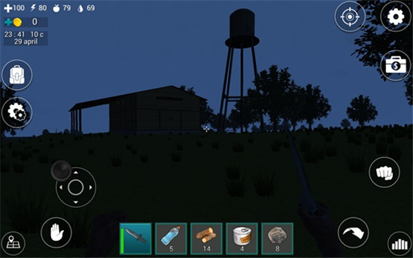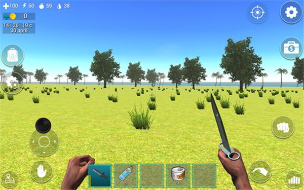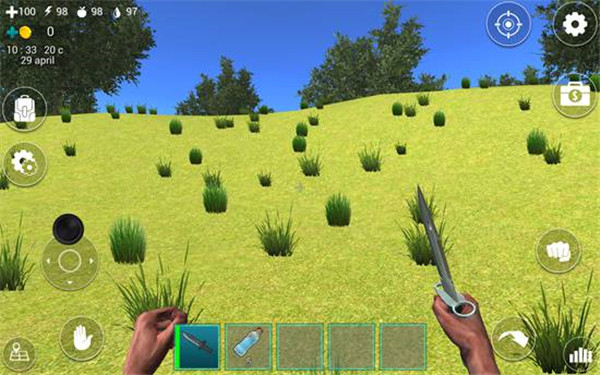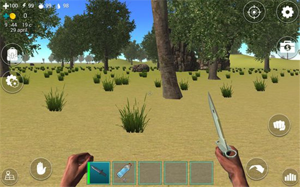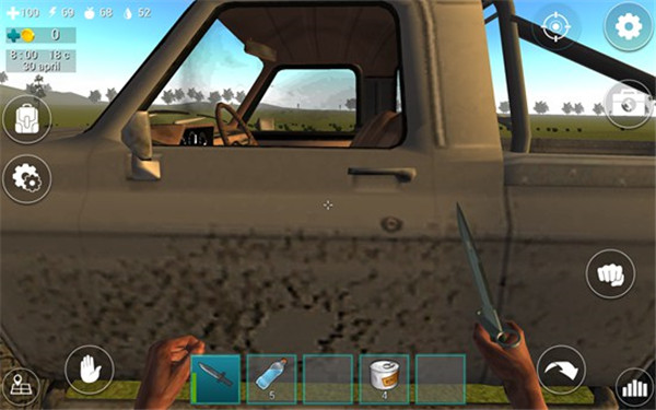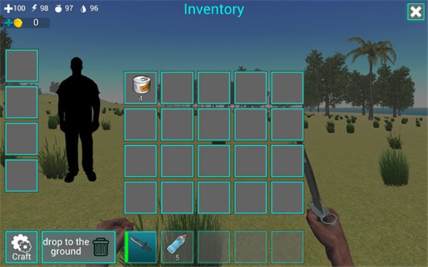 屏幕下方的道具栏里放着一把匕首和五瓶水,点击匕首就能把它握在手里。屏幕左上角有四个带数字的图标,依次对应着血量、体力值、饥饿值和口渴值。