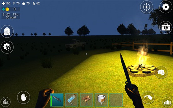 攻击野猪时,它会反过来攻击我们,小编建议大家前期别去招惹野猪,选小鹿会更好些,不过小鹿受到攻击就会逃跑,我们得一边追赶一边攻击,等它倒地后,就能得到肉食了。有了水、肉、火堆和汽车,接下来就是持续收集材料,提升自己的生活水平了。