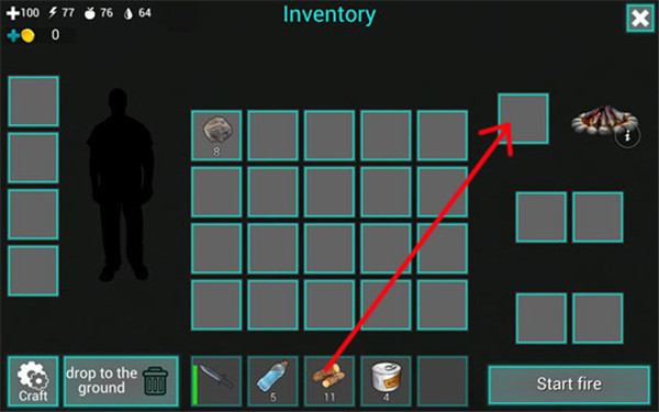 这时候会出现火堆和背包,我们得把木头拖到火堆里,不然没加燃料的话,火堆是不会燃烧起来的。