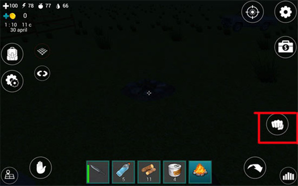 火堆摆放好后并不会自动燃烧,我们需要对准火堆,点击屏幕左下角的“手掌”按钮来点燃它。