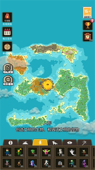 点击人形功能,既能创造文明生物,也能生成毁灭文明的怪物。