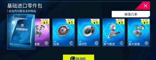 等级稀有零件在原有的最大速度、加速、操控性和氮气推进这几个属性分类基础上,新增了零件等级设定。它的功能与普通零件一致,但仅能装配在等级与之匹配的车辆上,且实际效果略优于普通零件。