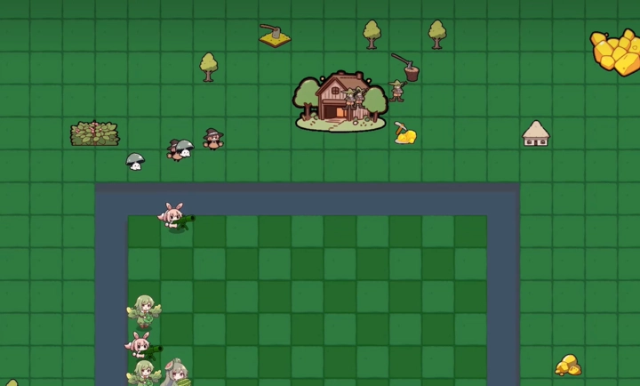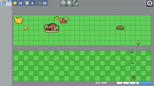 游戏内有种类丰富的植物,玩家可消耗相应资源解锁它们;为了获取这些资源,能够安排金矿工、伐木工和农夫去进行收集。