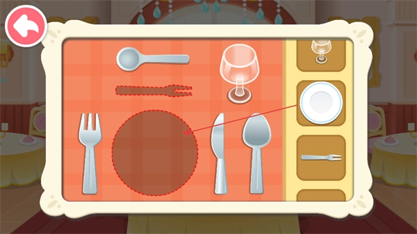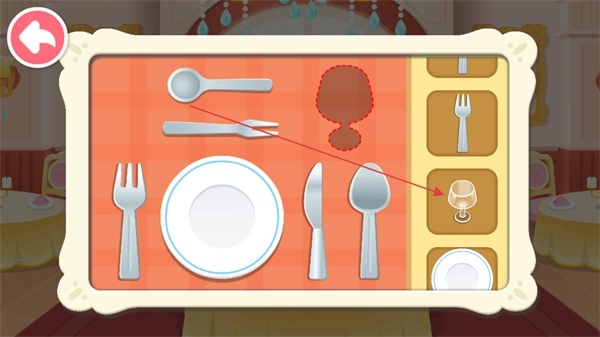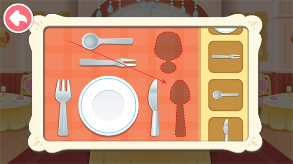 仔细观察餐盘上的餐具轮廓,把对应的餐具挪动到轮廓所在的位置,让两者相互匹配。
