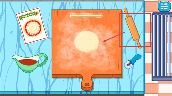 按照指引取用【擀面杖】,把面饼擀成合适的形状,这是制作披萨的核心基础步骤,再结合旁边的食谱准备后续的配料。