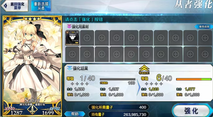合成不同的从者时,作为合成对象的从者能够获取经验值。当经验值积累到特定数值后,该从者的等级就会得到提升,其ATK(攻击力)和HP(生命值)也会随之相应增长。