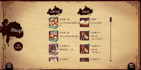 【商店】:游戏内的章节与道具购买服务在此提供,玩家能在此查看各章节的购买详情。