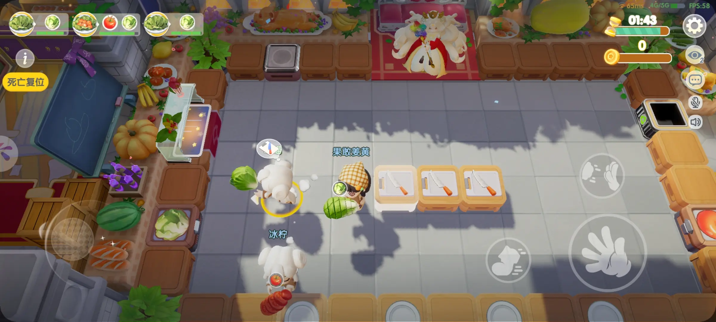 按照美食公主的指引,完成切菜、煎肉、灭火、冲刺、抛物、洗碗、影子分身协作、上菜、提升小费这些基础操作。
