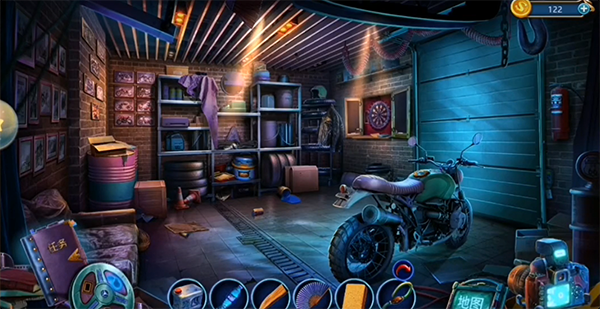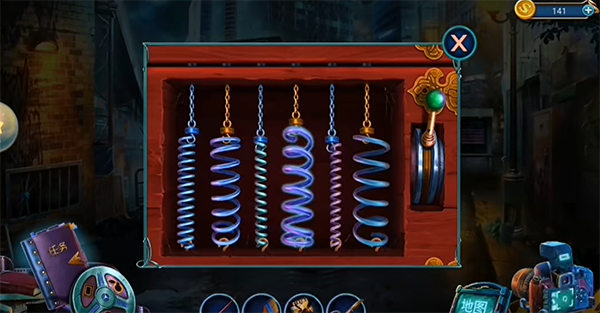 中偏右卷帘门子场景需借助【蛇形钩】与【操纵杆】,通过《猜谜寻物》的组合规则获取物品:相片与信箱组合得左区域信件(中下位置),手套与链条组合得左区域手铐(左下位置),小鸟与月亮组合得左区域猫头鹰(中上位置),手枪与子弹组合得左区域手枪(中间位置),绳子与捕兽夹组合得中区域鞭子(右中位置),钓鱼竿与鱼组合得中区域鱼钩(中下位置),太阳与树枝组合得中区域徽章(左上位置),双眼与放大镜组合得中区域望远镜(中下位置),针线与花组合得右区域玫瑰(右中位置),麦穗与圆帽组合得右区域草帽(左下位置),嘴唇与刷子组合得右区域口红(中下偏左位置),戒指与耳朵组合得右区域耳环(右下位置),最终可得到【火焰喷射器】