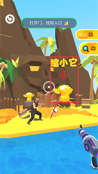 进入这个关卡后,任务是【打开门并找到入口】,要留意红色框标注的【缩小它】提示,对应的金色雕像是操作目标。