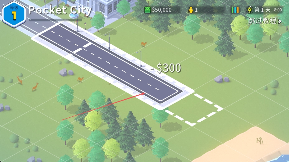 游戏开始后,先查看左上角显示的等级、资金等信息,接着规划道路建设方案,点击空白区域即可选择修建道路,同时会消耗对应的资金。