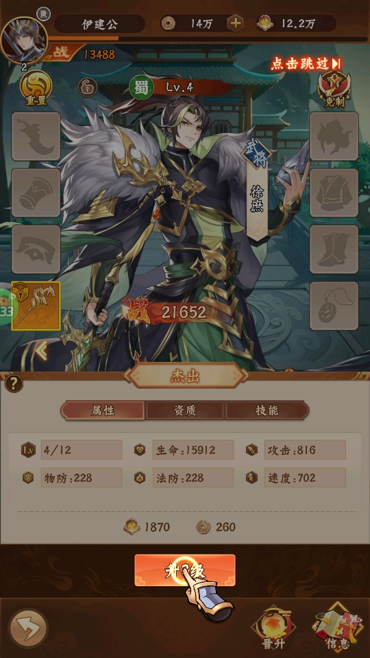 1、能够对自己拥有的武将进行等级提升,以此增加生命值、攻击力、物理防御等属性,进而增强整体战斗力;