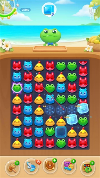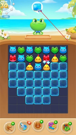 1、在第1关界面,匹配相同图案如青蛙、鸭子消除,积累分数,推进关卡。