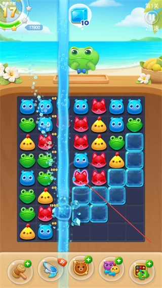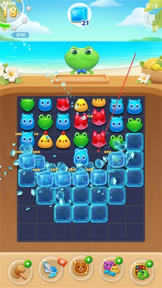 2、消除图案触发特效,打破冰块障碍,同时提升分数,向关卡目标前进。