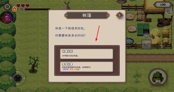 3、进入帐篷界面选择休息时长,恢复状态,保障冒险的持续进行。