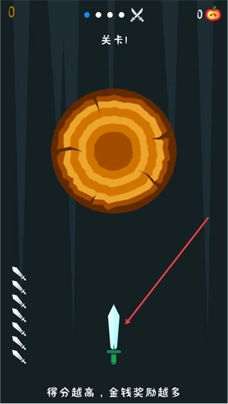 3、进入关卡1的玩法界面后,操控下方的剑切割上方木头,按提示得分越高,金钱奖励越多尽量提升得分获取更多奖励。