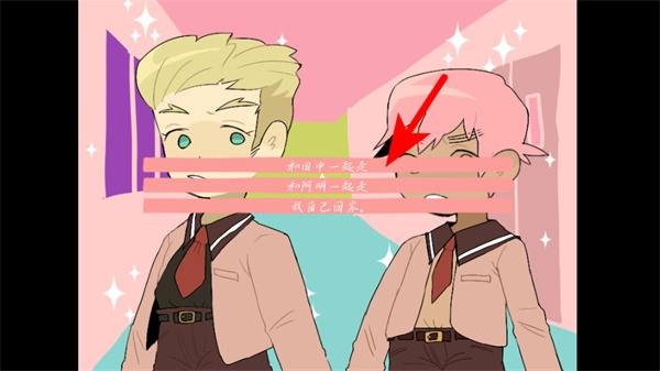 2、在出现选择界面时,可根据剧情走向需求,选择和田中一起走,和阿明一起走或我自己回家的选项。