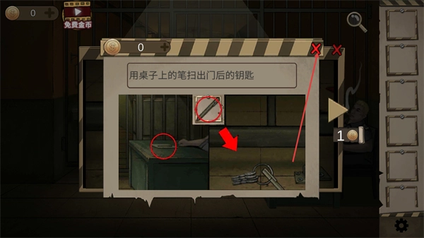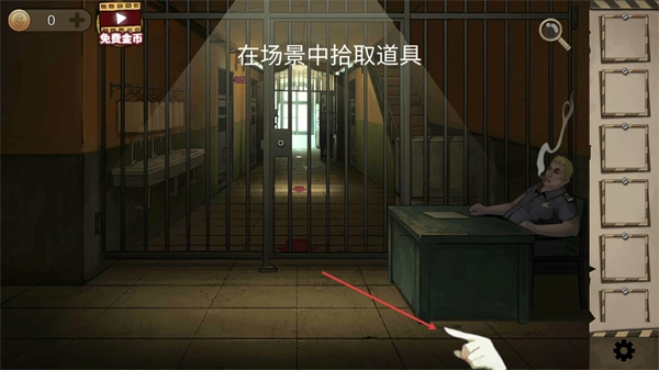 1、在这个监狱逃脱场景里,按照提示在场景中收集道具,点击桌子下方掉落的笔,收集场景内的道具来推动逃脱进程。