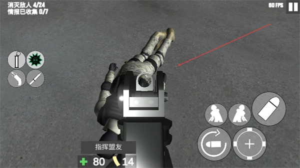 2、操控角色持枪攻击敌人,推进消灭敌人0/4的任务进度。