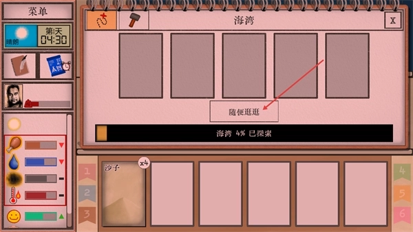 2、进入海湾界面后,点击“随便逛逛”来开展区域探索。目前该海湾的探索进度为4%,在探索过程中能够收集到沙子这类基础资源。