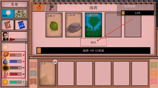 1、在生存基础界面查看初始任务,先开展探索海湾的行动以寻找新地点和资源,之后还得完成磨利石头、获取椰汁与椰肉的任务。