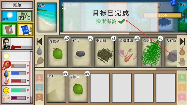 完成探索海湾的任务后,界面会显示目标已达成,并且能够获取到青椰子、石头、小树枝这类多种生存必备的资源。