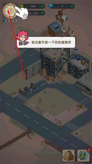 1、进入游戏主界面后,跟随界面中的指引提示,点击左上角的齿轮样式按钮,触发避难所升级的相关操作,进入避难所升级的准备界面。