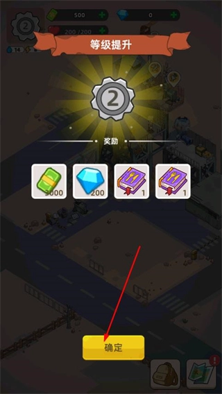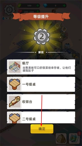4、确认解锁设施后,界面会显示升级对应的奖励,点击确定领取奖励,利用这些资源建设新解锁的设施,通过设施为幸存者提供服务,积累资源继续提升避难所等级。