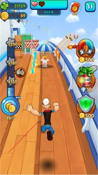 1、操控大力水手躲避障碍,沿赛道奔跑,收集道具,推进距离至864米。
