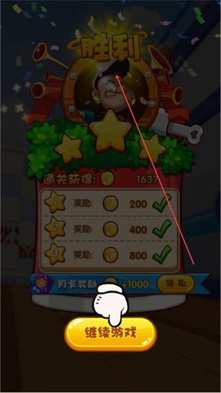 4、通关后显示胜利,获得1637通关得分,点击继续游戏进入下一关。