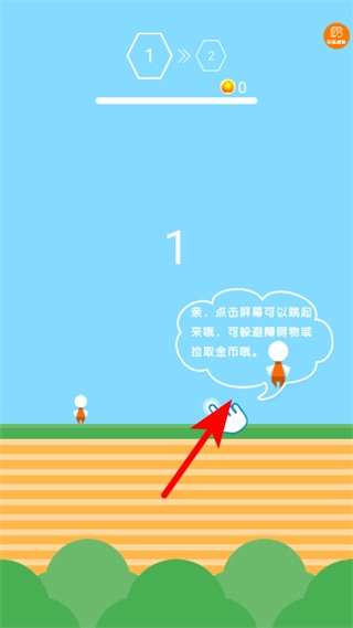 2、游戏中依照箭头指引,点击屏幕控制角色跳跃,借助跳跃动作前进,同时可收集场景中的金币道具。