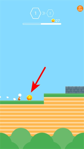 3、紧跟红色箭头指引,继续通过点击屏幕让角色跳跃,靠近并收集场景内的金币,积累关卡收益。