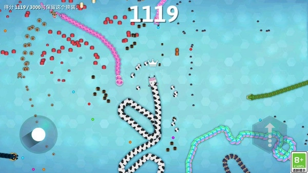 3、面对其他玩家的蛇,选择避让、周旋或主动设陷阱,诱导弱小蛇类撞击自身,吞噬其尸体能量快速成长。