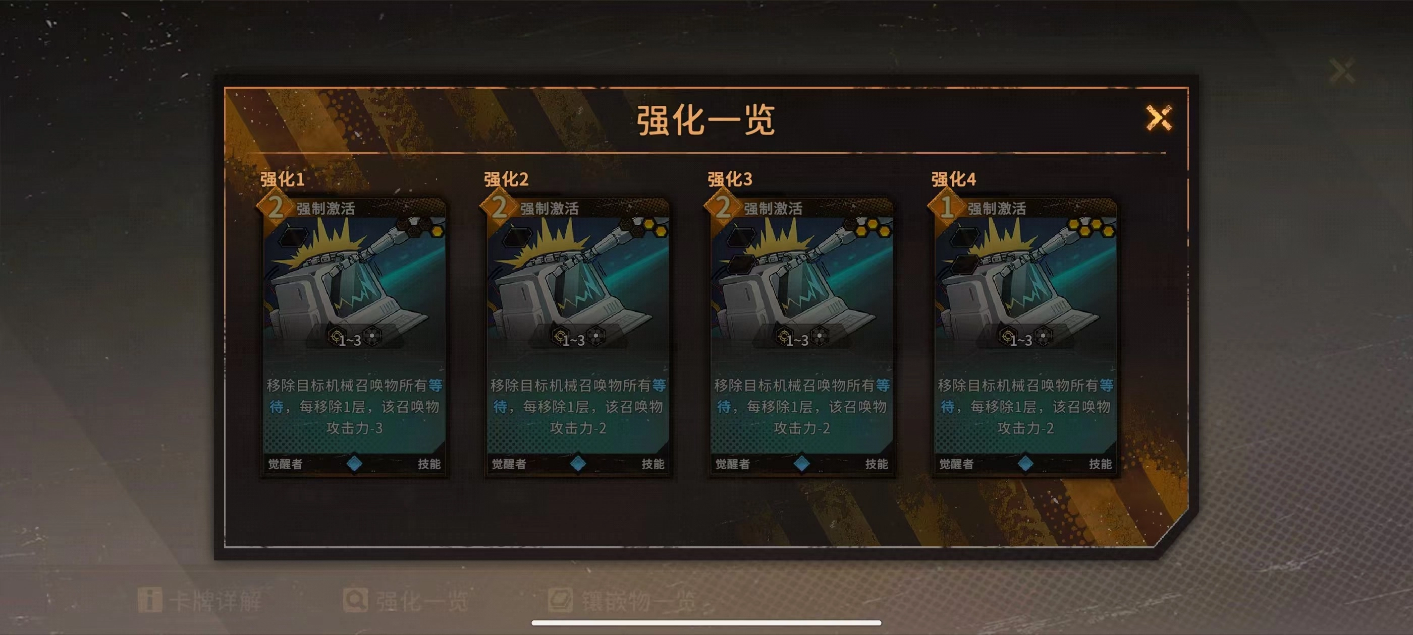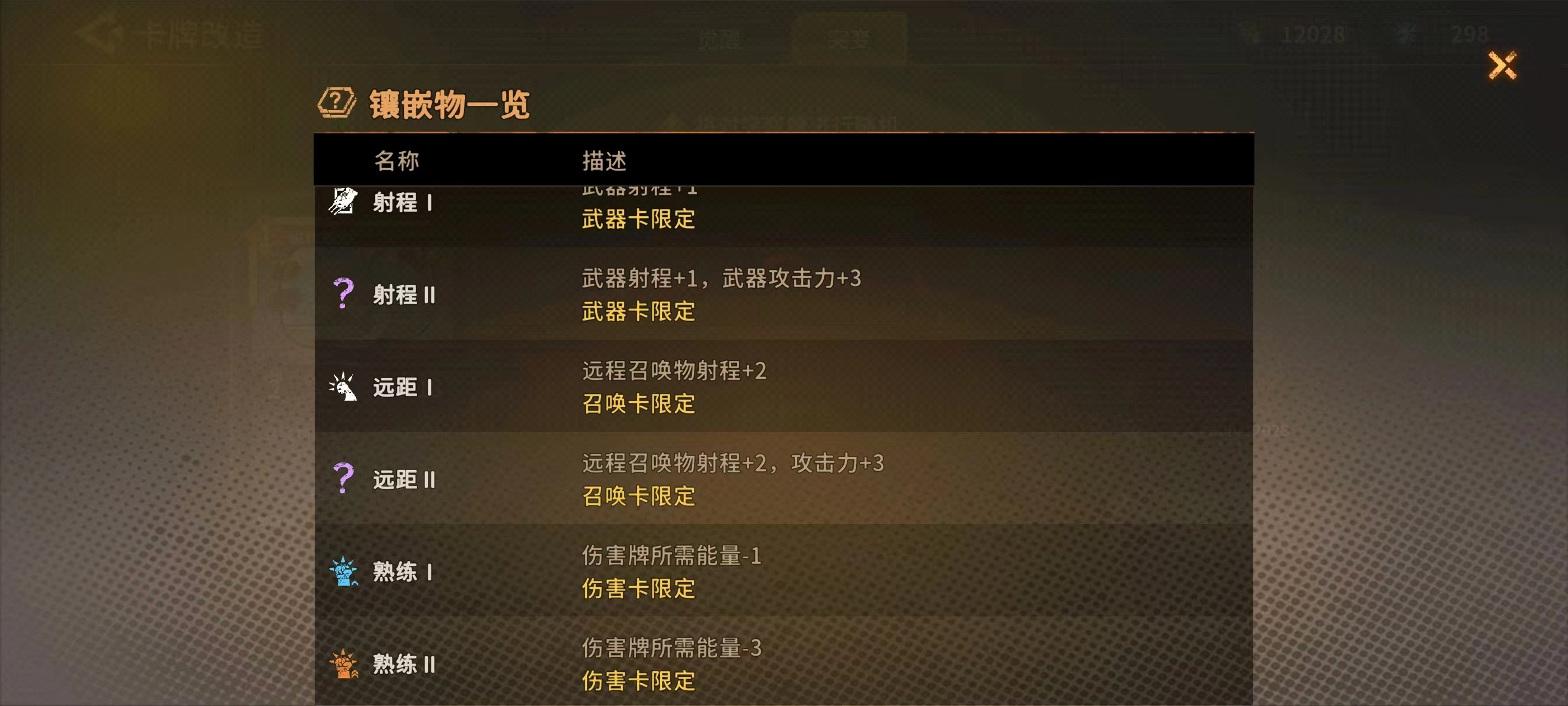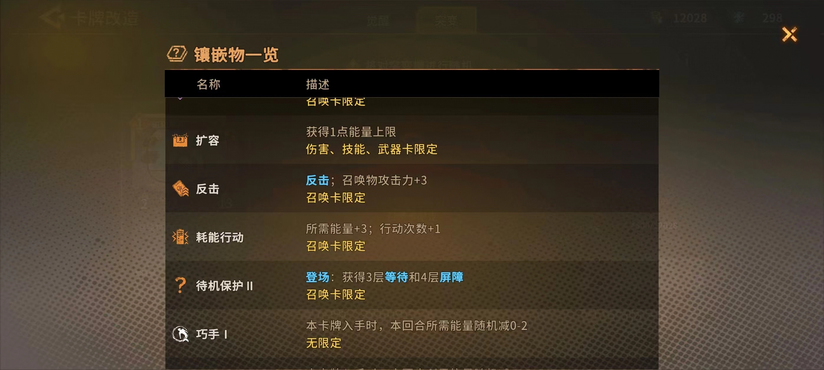 镶嵌物相关说明如下:卡牌强化至两级时会自动获得镶嵌效果;每次获取卡牌时,有一定概率得到自带镶嵌物的卡牌;商店中设有专门为卡牌镶嵌镶嵌物的功能区域。关于镶嵌物的具体效果,可点击“镶嵌物一览”查看详情。
