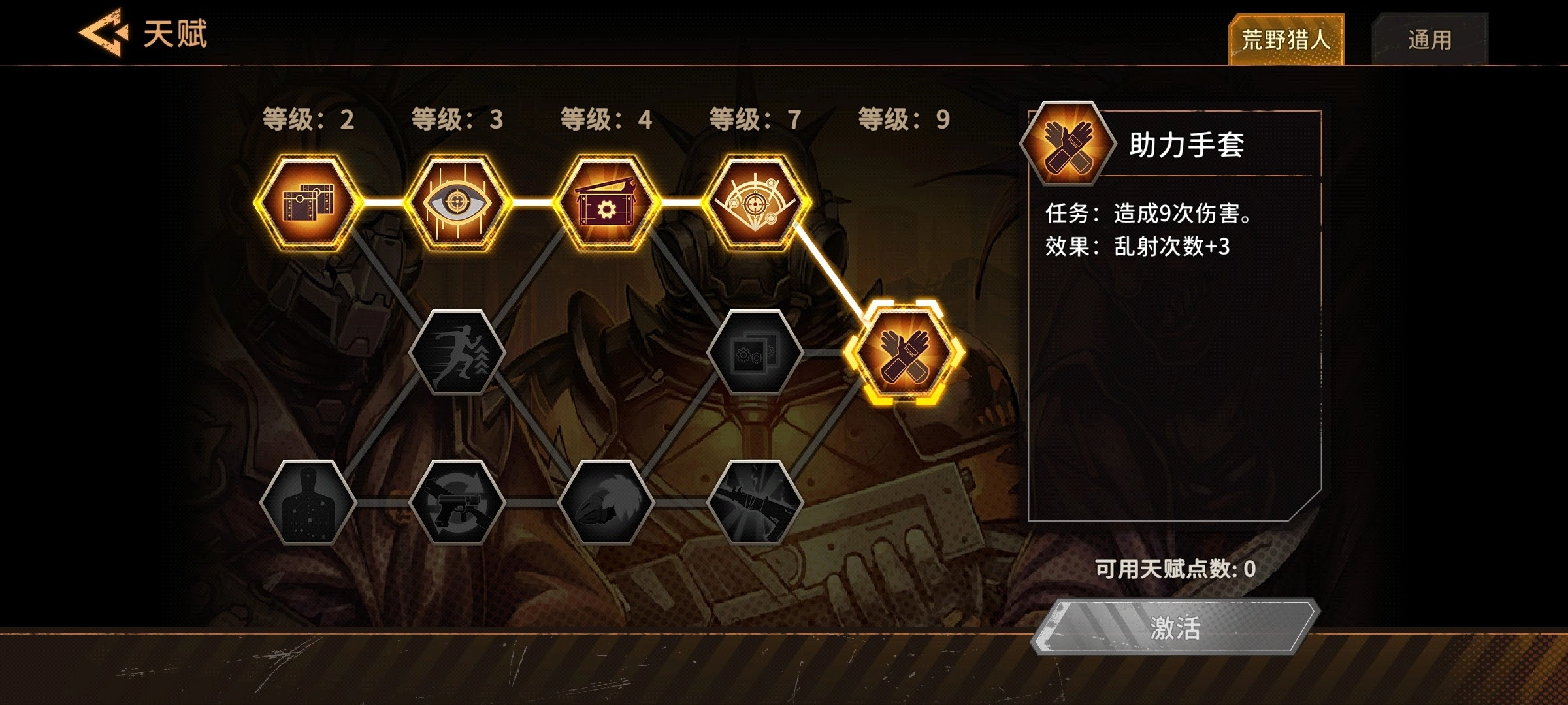 开局先把猎人的三个基础技能都点出来,接着在通用技能里优先加技能冷却和抽卡相关的选项;到7级时解锁猎人的第四个技能并点上,8级选通用里的强攻战术,9级可以考虑助力手套(普通难度下很容易刷到,没有的话暂时不用也不影响)。