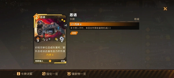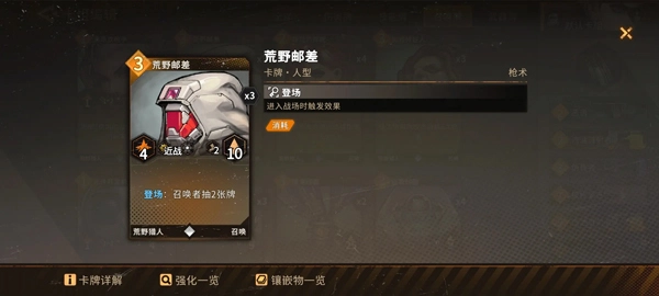 荒野猎人在获取手牌方面拥有充足的途径,无论是依靠自身天赋技能带来的抽牌效果,还是通过各类卡牌本身的抽牌机制,都能让其保持较为充裕的手牌数量。像武器类的游猎者卡牌、召唤类的荒野邮差(快递)卡牌,都能在这方面为其提供有力支持。