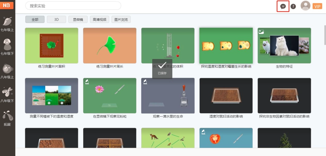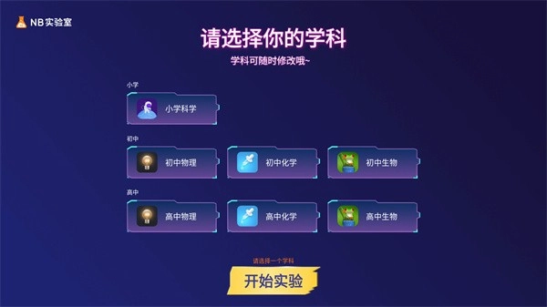 你可以先从小学到高中阶段的化学、物理、生物等科目里挑选一个,然后点击页面下方的【开始实验】按钮。
