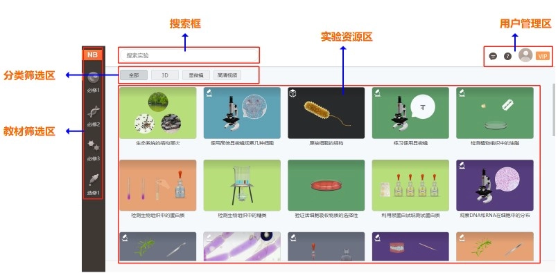【初高中生物实验文控界面】主要涵盖五个区域,分别是【教材筛选区】、【分类筛选区】、【搜索框】、【实验资源区】和【用户管理区】。需要说明的是,高中阶段不存在【图片浏览】资源,除此之外,其他区域与初中阶段大致一致。